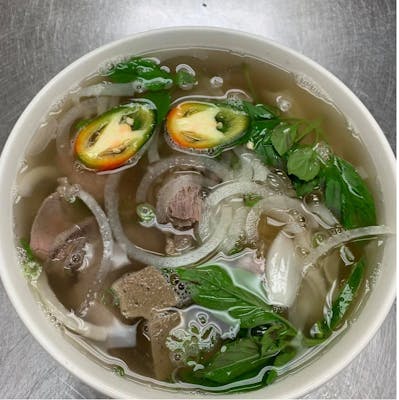 Traditional Vietnamese beef broth soup with rare steak, tendon, meatballs, and tripe!