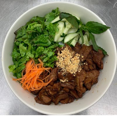 A classic Vietnamese dish with cold-rice vermicelli noodles topped with fresh salad, basil, cucumbers, pickled carrots, peanuts, and dressed in fish sauce (nuoc mam).